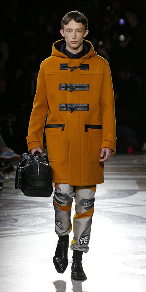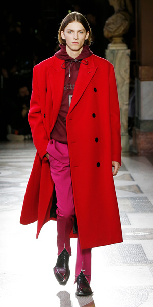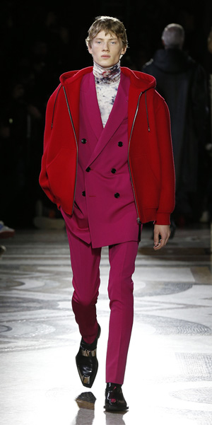 La propuesta masculina de Van Assche combinó diferentes tonalidades. Iluminó el escenario con siluetas en fucsia combinado con rojo; en contraste, los abrigos de piel de canguro en color rojo brillante que hizo juego con sudaderas de amplio corte.
