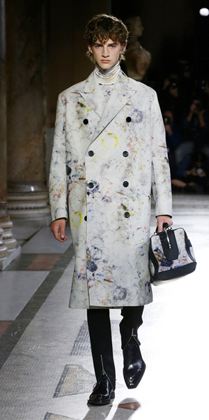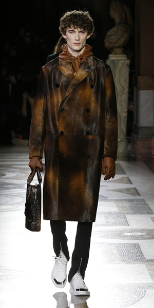 El diseñador apuesta una visión contemporánea enfocada en el calzado de lujo. Resalta el arte de la pátina; técnicas para teñir y blanquear el cuero donde se aplica aceites esenciales, disolventes, pigmentos y tintes. Berluti ha sido una marca que ha desarrollado zapatos únicos gracias a la despigmentación del cuero; lo que da como resultado, la gama divertida de colores y contrastes, que en la pasarela, lucieron con pantalones de cuero teñidos a mano.