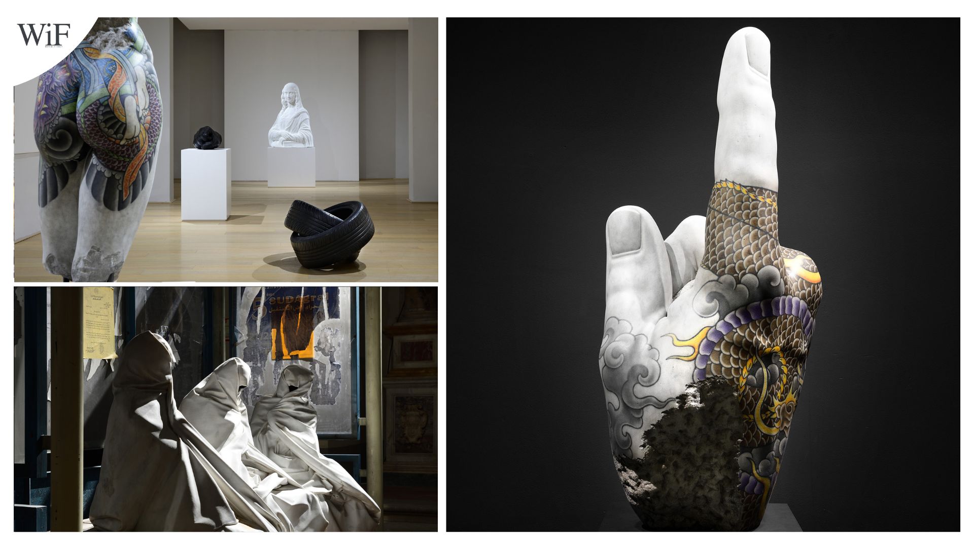 Pensemos en los bustos antiguos o en los puños tatuados que quizá se encuentren entre sus obras más famosas, o igualmente famosas son las esculturas que parecen de poliestireno (la Niké o la Calavera) pero que están talladas en mármol, o los neumáticos, también en mármol, que engañan al ojo del espectador. Tanta es la perfección de la ejecución que recuerda al caucho blando.