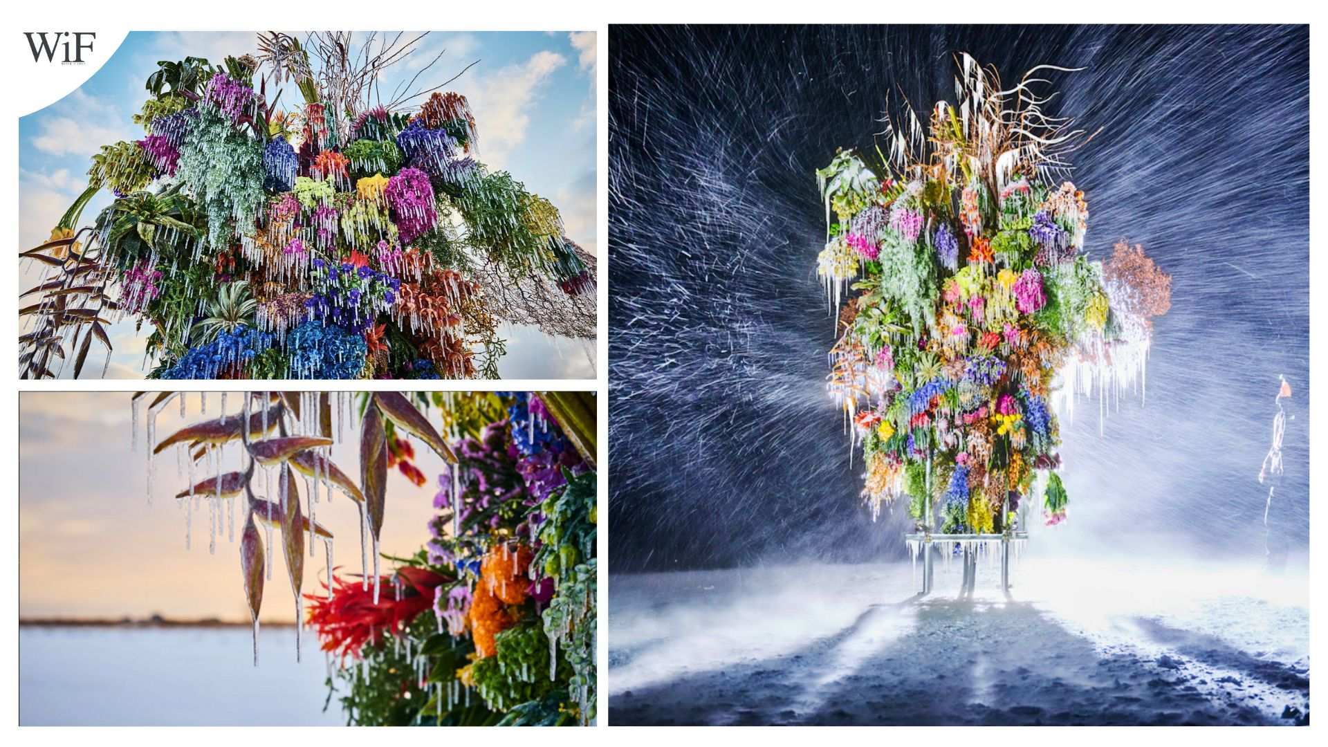 Por ejemplo, en un lago helado de la península de Notsuke, un zarcillo de tierra que sobresale de la costa este de Hokkaido, Azuma Makoto logró crear tres esculturas botánicas de una serie llamada Frozen Flowers. La primera fue creada en 2019 y se repitió en 2021 y 2022. El artista considera que cada año las condiciones han sido ligeramente diferentes y el resultado ha sido extraordinario. El artista se interesa por cómo variables como la temperatura, el viento o la nieve pueden alterar el entorno y hacer que cada versión sea única.