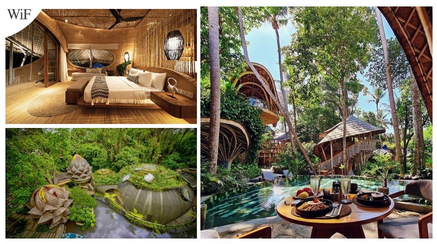Floating Lake Villa: Construida sobre un lago biofiltrado con peces koi, incluye una terraza flotante, hamaca sumergida y una bañera de teca artesanal.